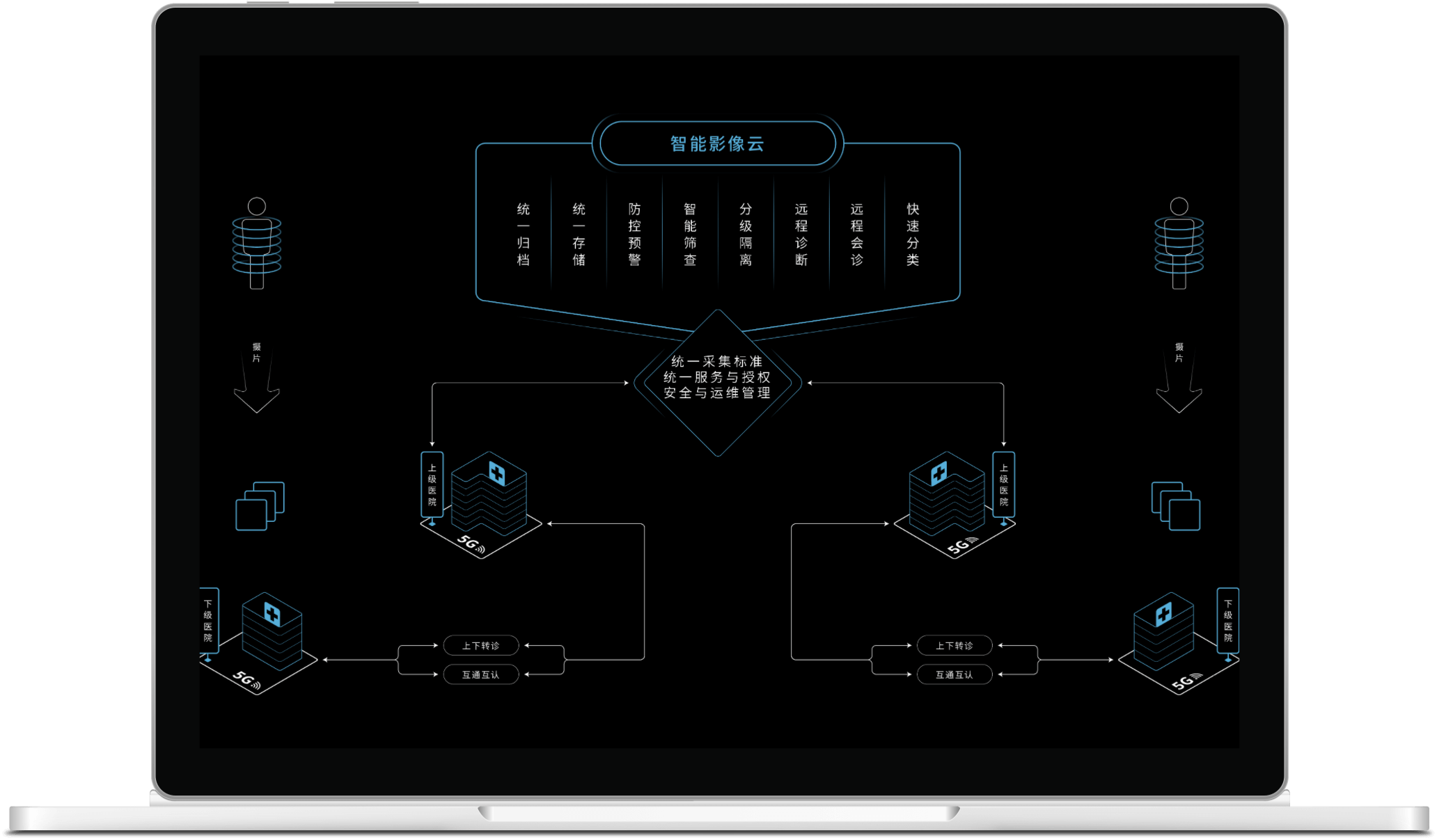 构建以县区级医院为中心的“区域影像中心”,通过省、市、县、乡、村五级医院的远程业务协同,在此基础上构建覆盖影像、超声、心电、病理、检验工作流的五大医技中心,同时实现区域影像数据云端互联互通,统一集中管理。